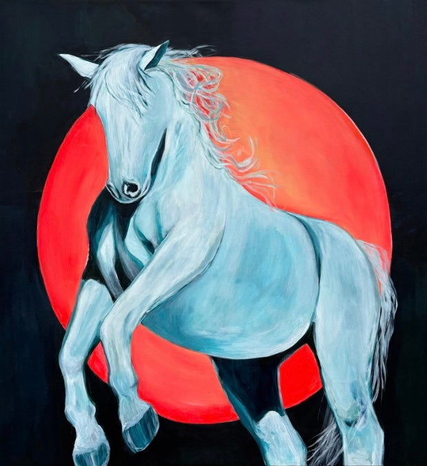 Original acrylic painting of a white and blue horse reared in front of a searing sun and dark sky. Painted on 1.5" thick gallery wrapped canvas. Measures 48" x 52" inches.